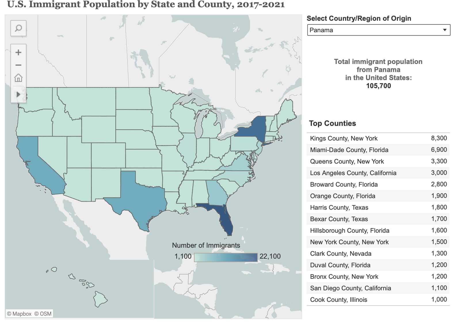 As of 2019, the total immigrant population from Panama in the United States was 103,300